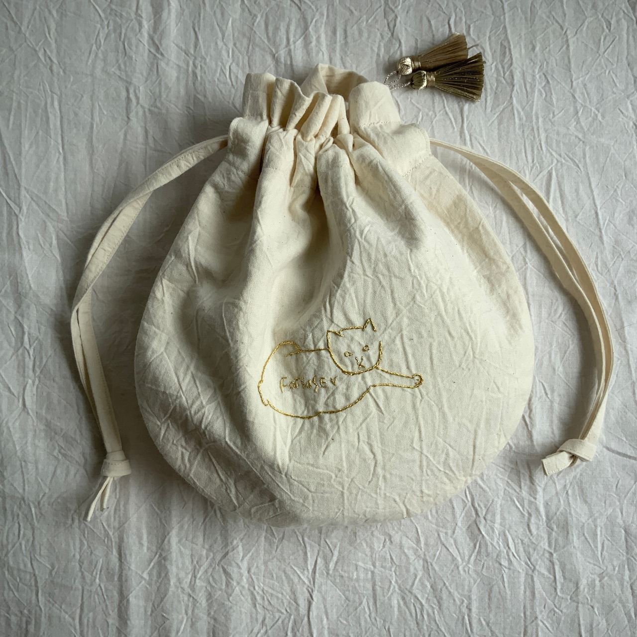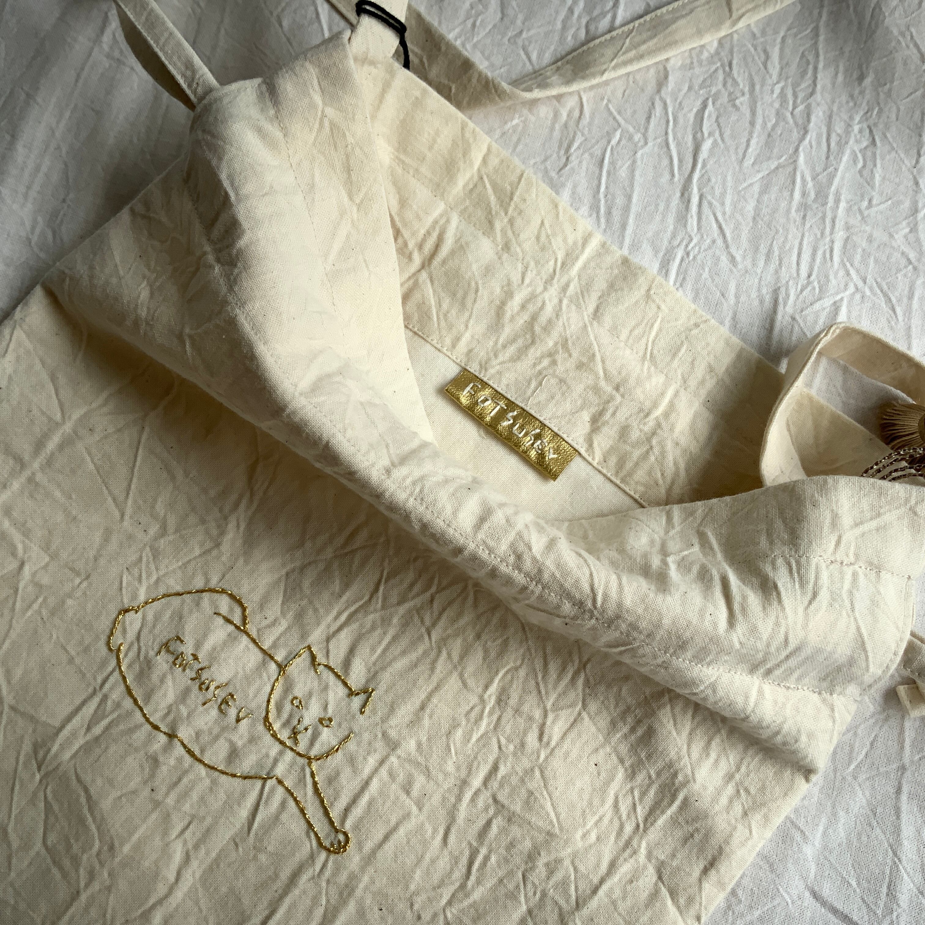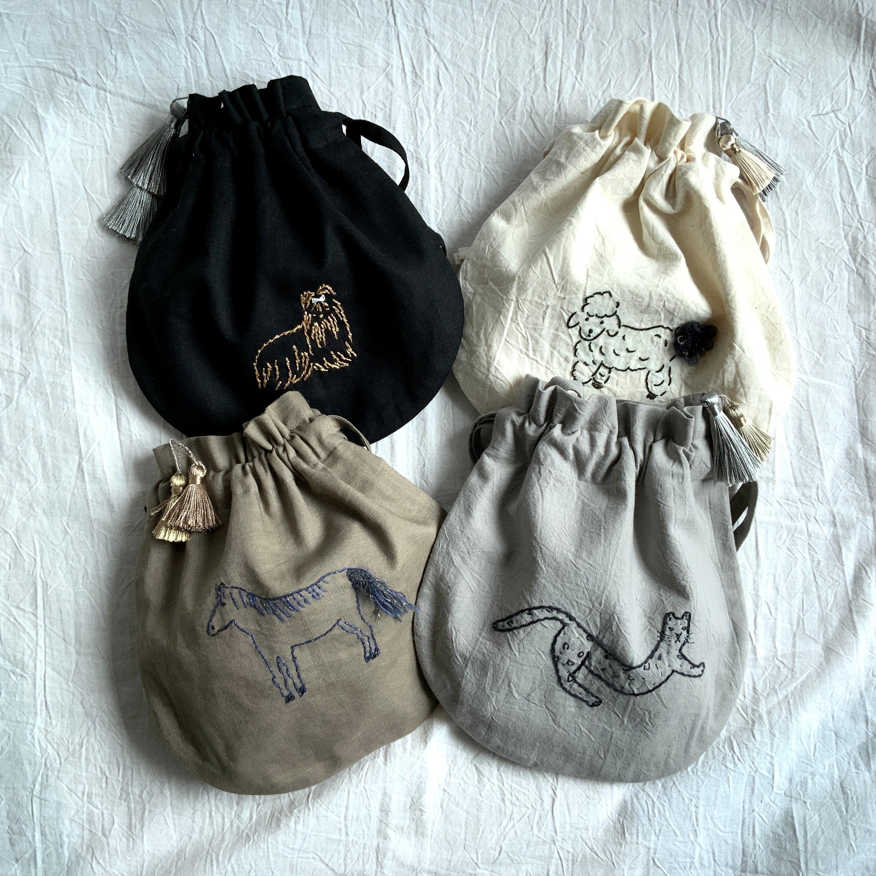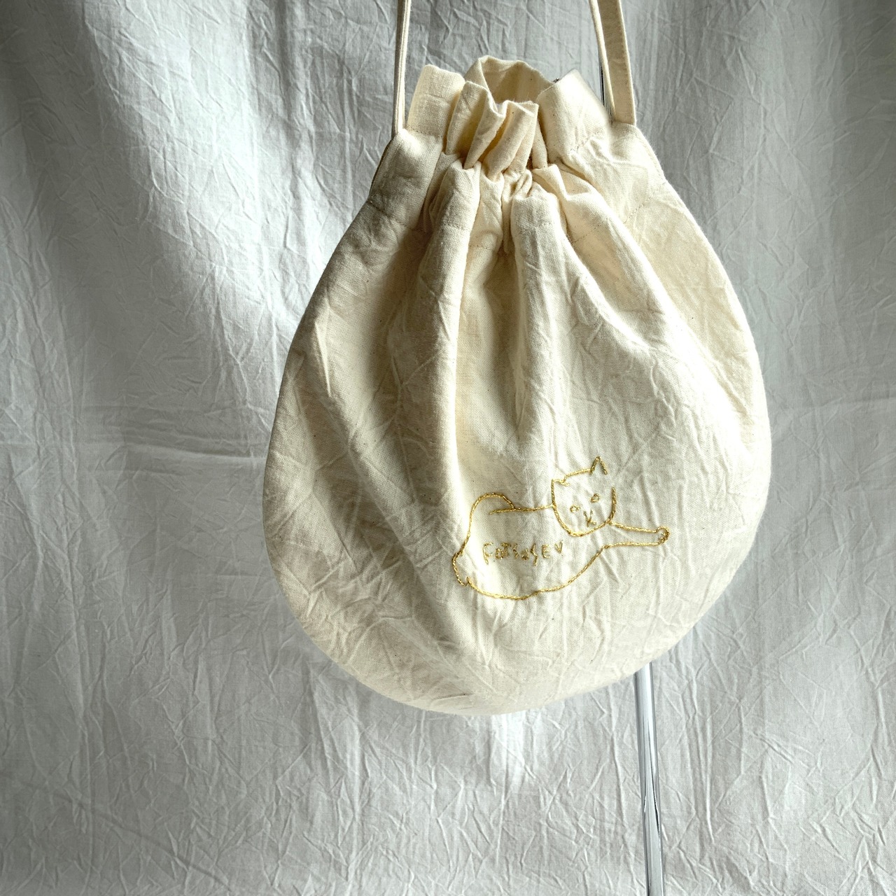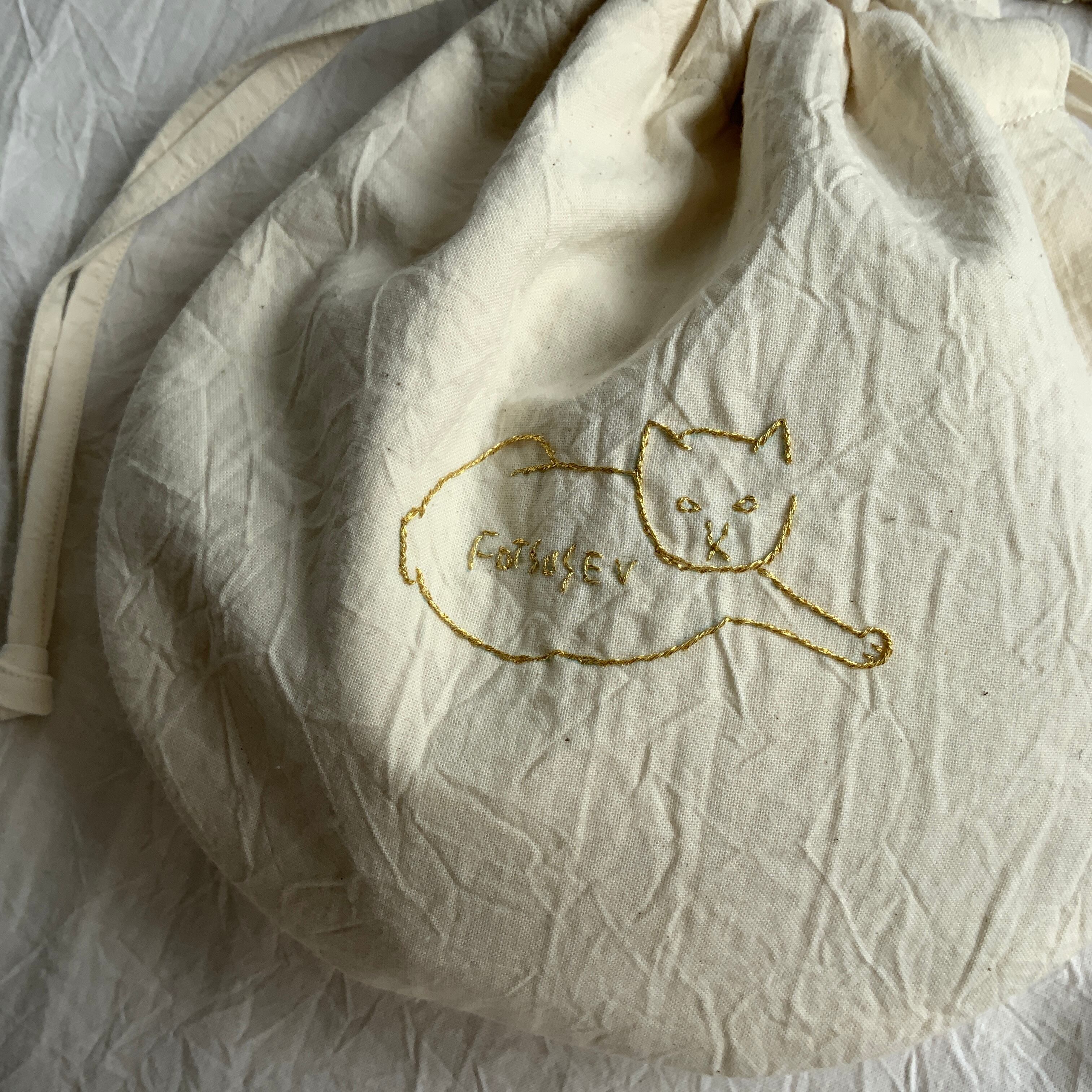 刺繍巾着 「fotsusev猫」生地アイボリー(コットン)