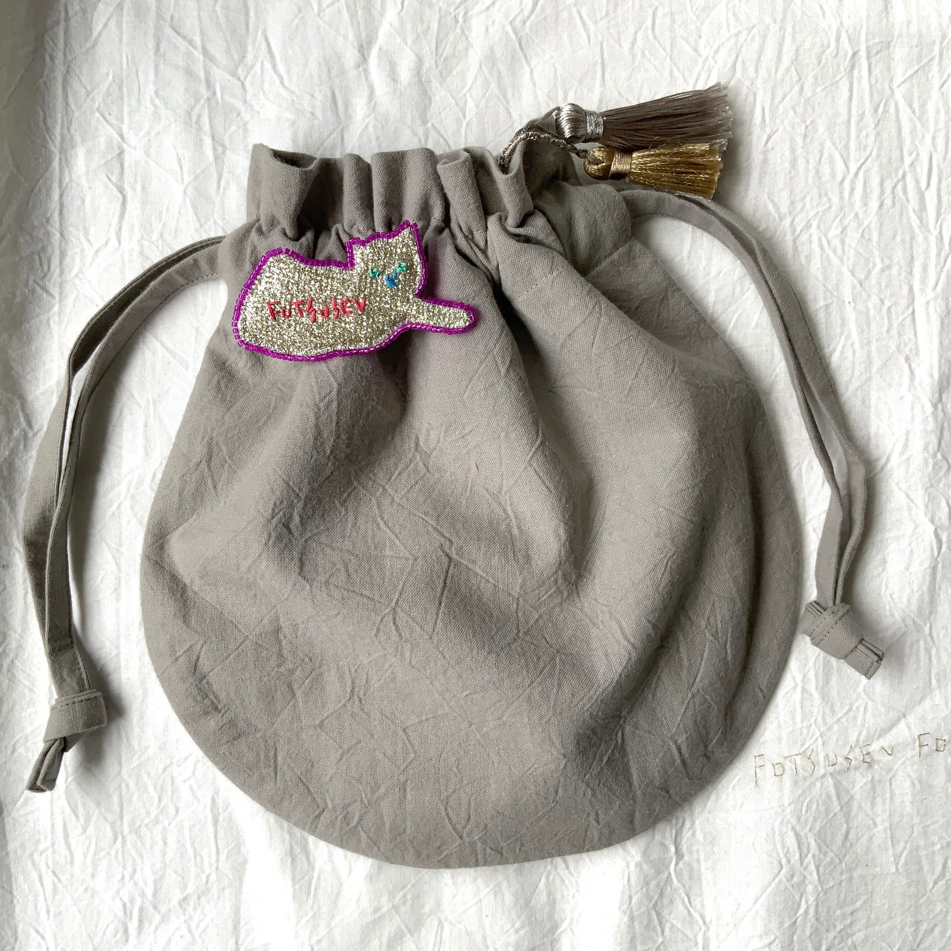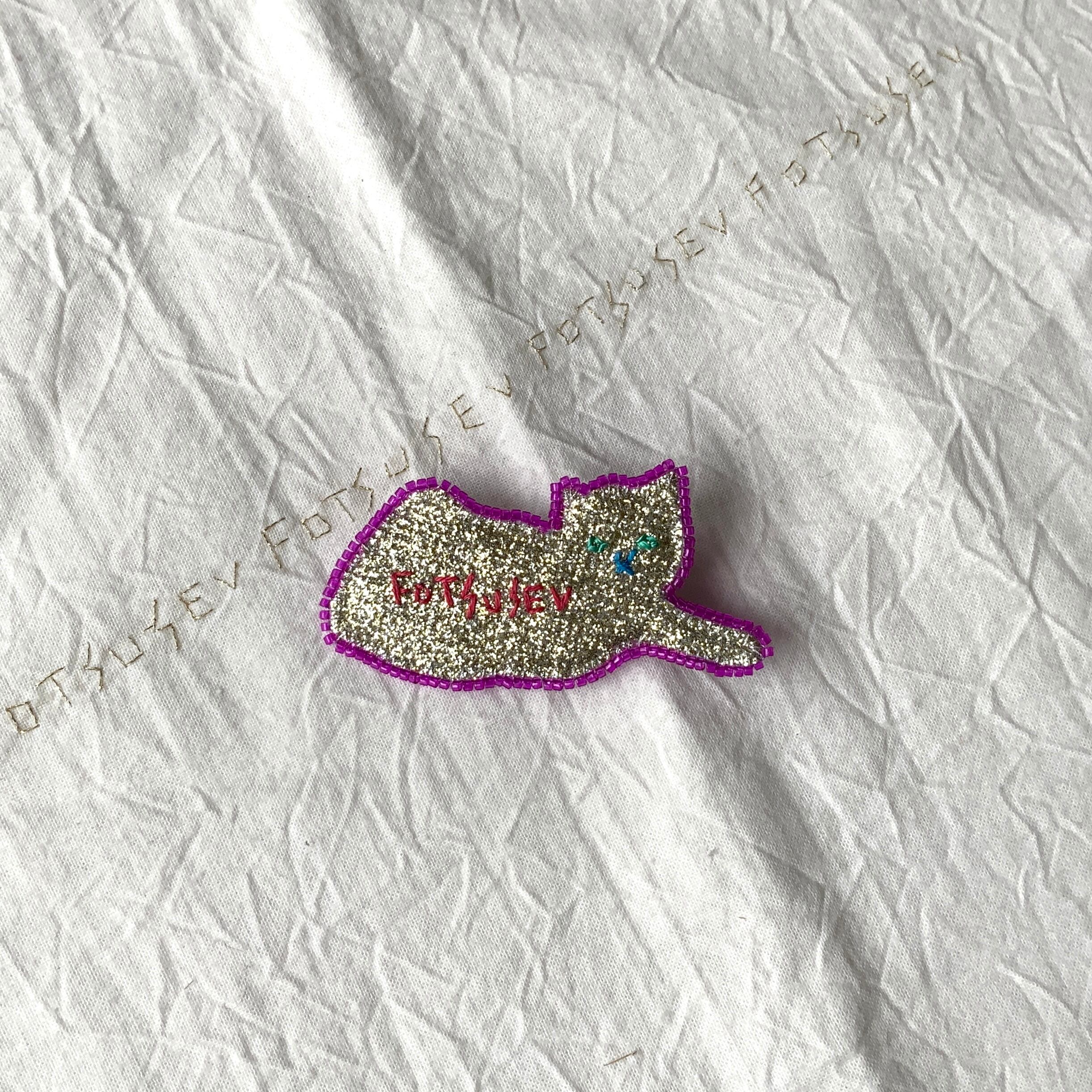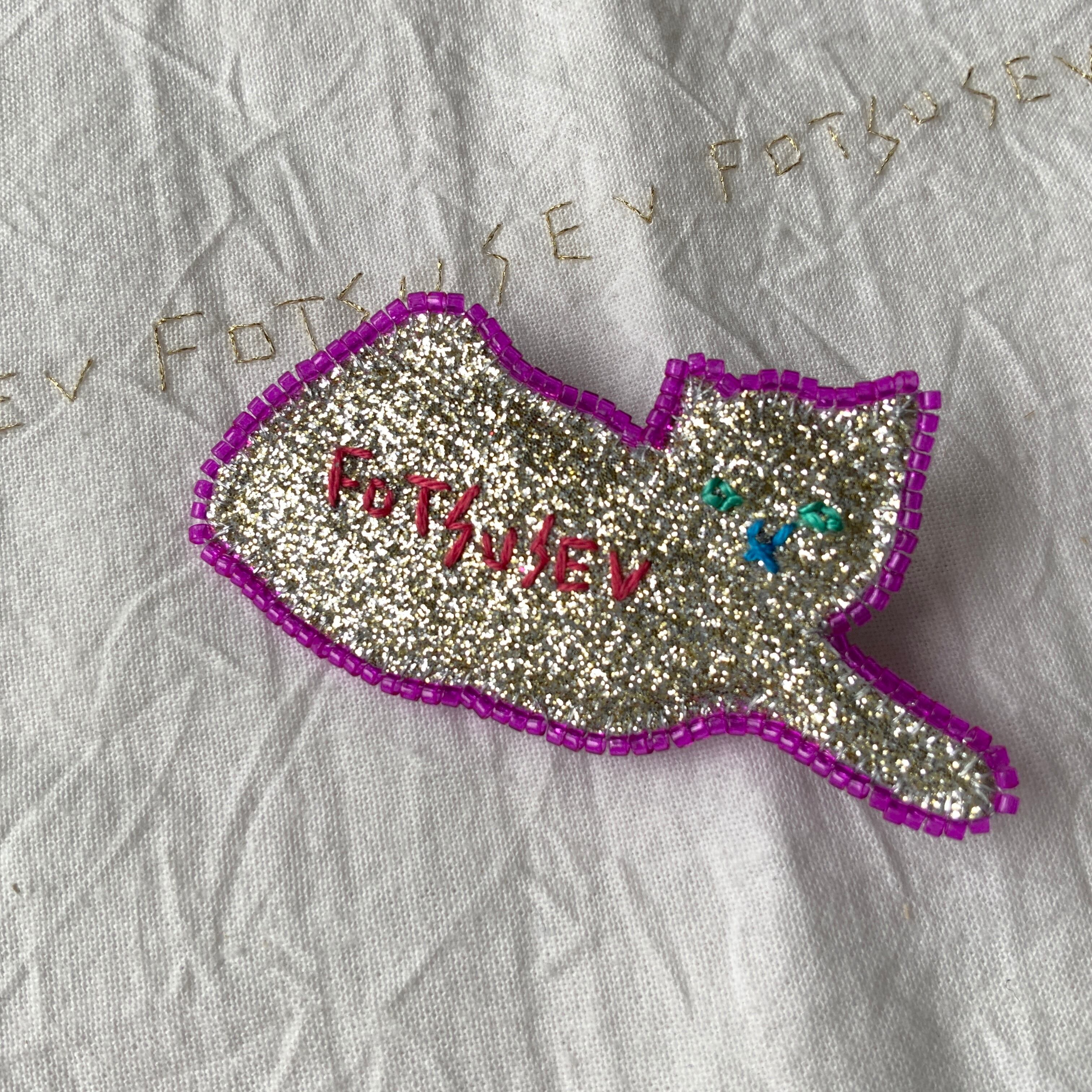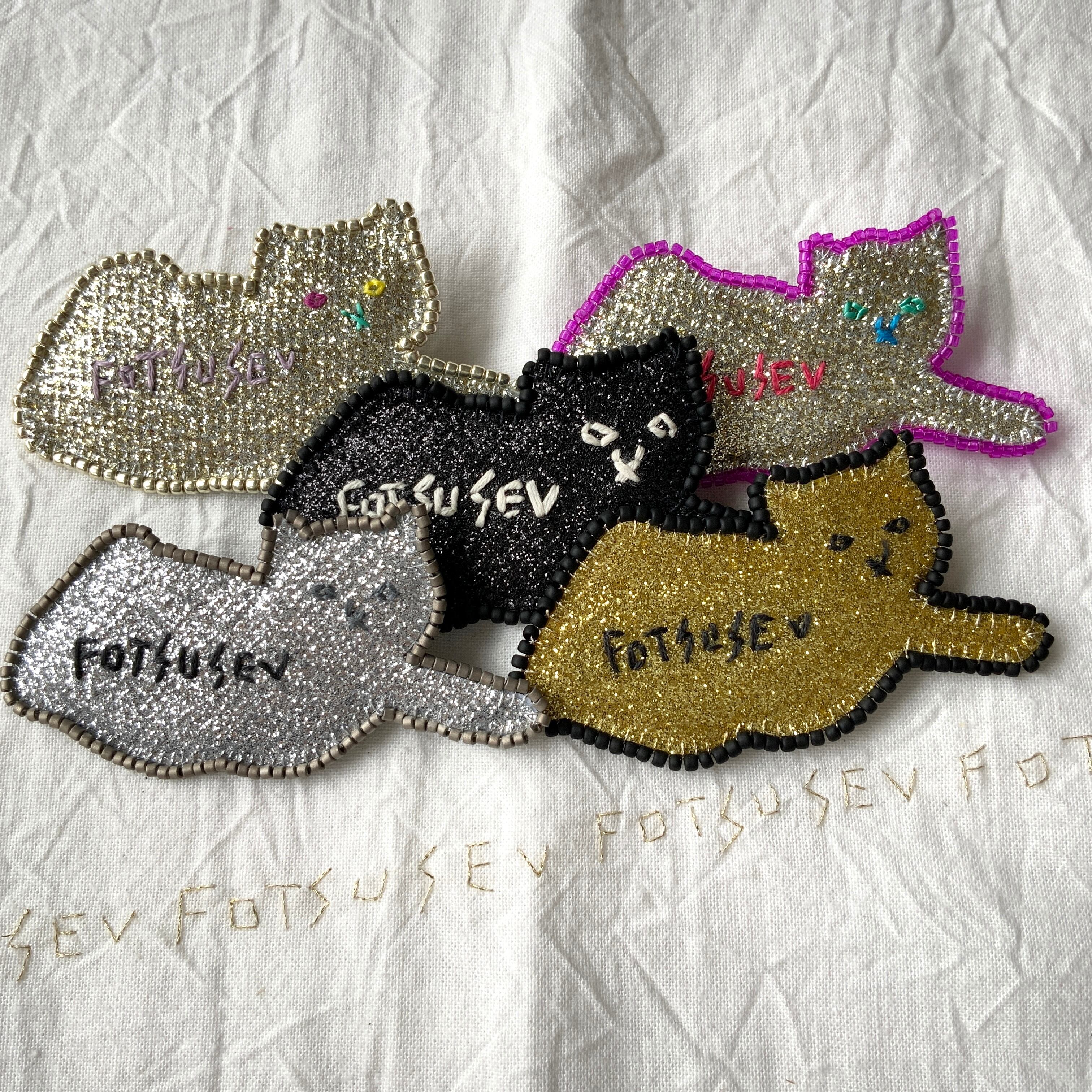 ラメ合皮生地、刺繍糸、ビーズ、回転式ブローチピン(日本製)