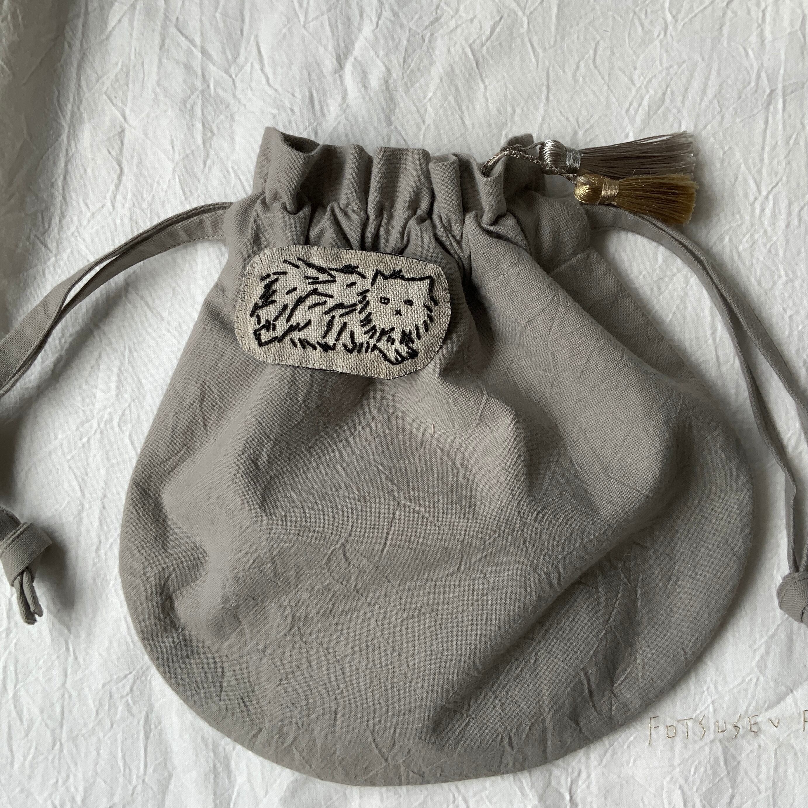 ベージュのリネン生地に、太めの少し光る黒糸で刺繍しています。
